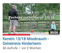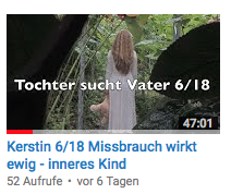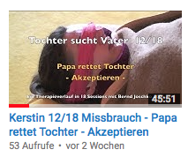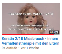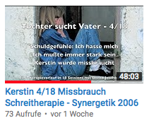 4/18 - „Schreitherapie!“ - Hier in der 4. Session bekommt Kerstin tiefe Schuldgefühle und will die 4jährige nicht annehmen, weil sie ja mitgemacht hat. Sie hasst sich dafür. Die Kleine mußte immer stark sein und brauchte niemand. Jetzt wendet sich Kerstin auch gegen sich selbst und will ihr inneres Kind wegschicken. Der Therapeut zeigt ihr auf, dass die kleine Kerstin völlig alleine ist. Ihr Vater soll sie annehmen, denn das ist seine Aufgabe. Kerstin macht "Schreitherapie": Sie fängt an sich zu wehren, schreit ihren Stiefvater und ihre Mutter an, bis das innere Bild kippt und zu einer liebevollen Mama wird, die sie beschützt. Doch der Vater ist noch schwach...
