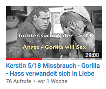 5/18 Ein Gorilla wartet auf Kerstin, er verbildlicht ihre Angst. Sie fühlt sich klein und hilflos. Wer steckt hinter diesem Gorilla? Sie will es wissen, doch hat sie auch Angst davor, Angst vor den Konsequenzen aus der Familie entfernt zu werden - ihr Bruder will das nicht. Sie findet alle feige, auch verachtet sie sich selbst. Hass kommt hoch... sie wehrt sich solange, bis der Hass sich in Liebe, Lebenslust und lachen verwandelt.